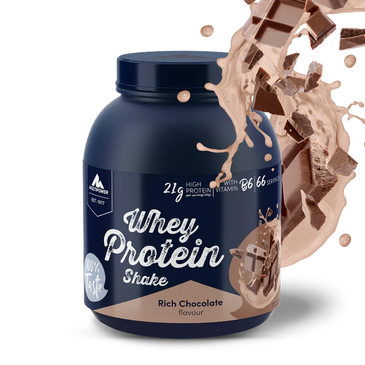 Dietary supplement. Instantised powder for producing a protein-rich, whey-protein-based drink. With sweeteners. Enriched with vitamin B6.