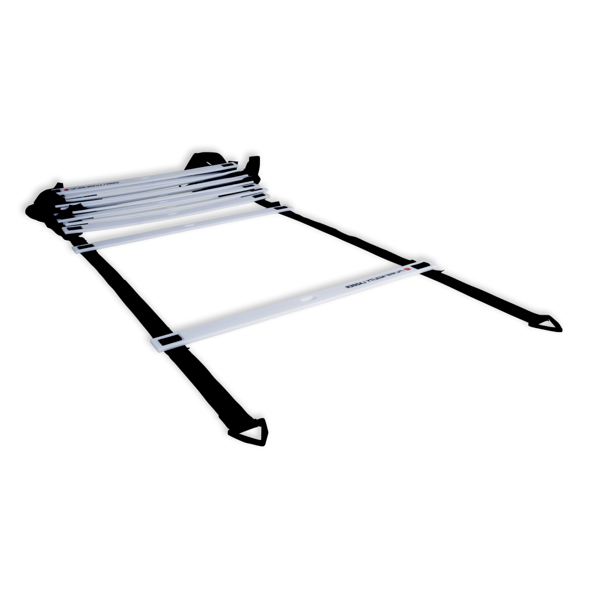 The agility ladder features steps that are permanently fixed in position. Each end of the ladder has side-release buckles for connecting additional ladders to create a continuous ladder. The agility ladder is beneficial for athletes in all disciplines such as soccer, rugby, hockey, cricket, basketball, etc.