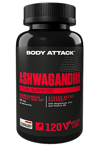 The ultimate superfood for peak performance has a name: ASHWAGANDHA from BODY ATTACK. High-dose vegan Ashwagandha, 600 mg of KSM 66 brand raw material per daily serving! Ayurvedic medicine has long relied on Indian ginseng for its ability to reduce biological stress. You need optimal recovery to build muscles, and you get it with the additional magnesium, zinc, and vitamin B6 included in each ASHWAGANDHA capsule!