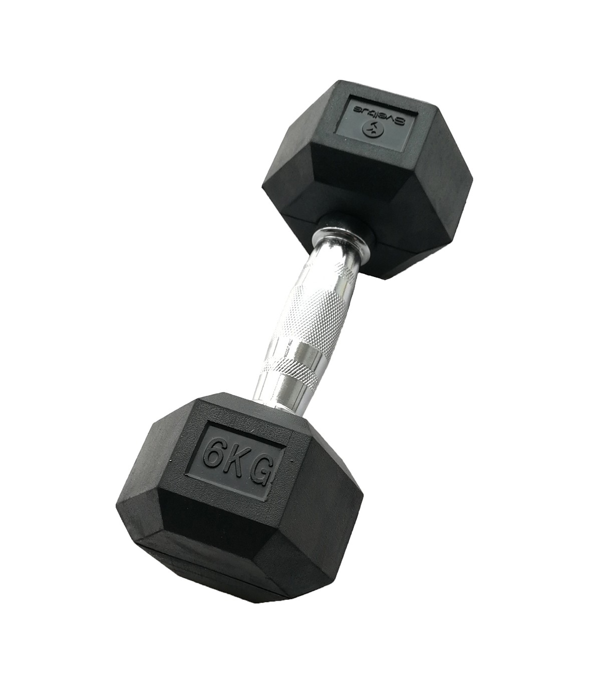 Its hexagonal shape prevents it from rolling (6 sides). It is covered with a highly resistant and durable layer of rubber that protects it from shocks and minimizes noise. The chrome ergonomic handle has a non-slip zone for a perfect grip.