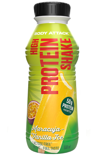The High Protein Shake from Body Attack is ideal for muscle mass gain, containing 50g of protein/500ml.