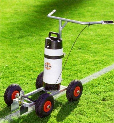 Wet marking trolley, model FM704, equipped with a 10-liter plastic tank and a manual plastic pump.The spray nozzle is positioned within the operator’s field of vision, adjustable in height, and easily controlled via a hand lever located on the guide bar. The pump automatically stops when the spray lever is released. The line width can be flexibly adjusted between 50 and 120 mm.