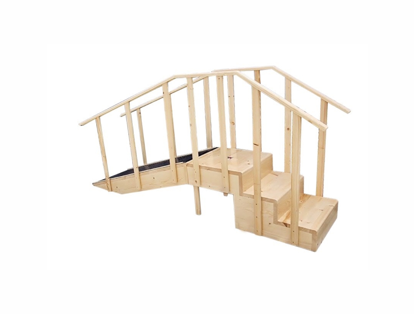 Handrail made of spruce wood The wooden ramp is covered with non-slip rubber material. The incline angle is 24 degrees. Dimensions: 273 x 65 x 60 cm.